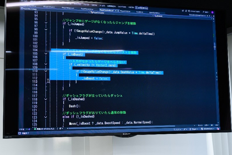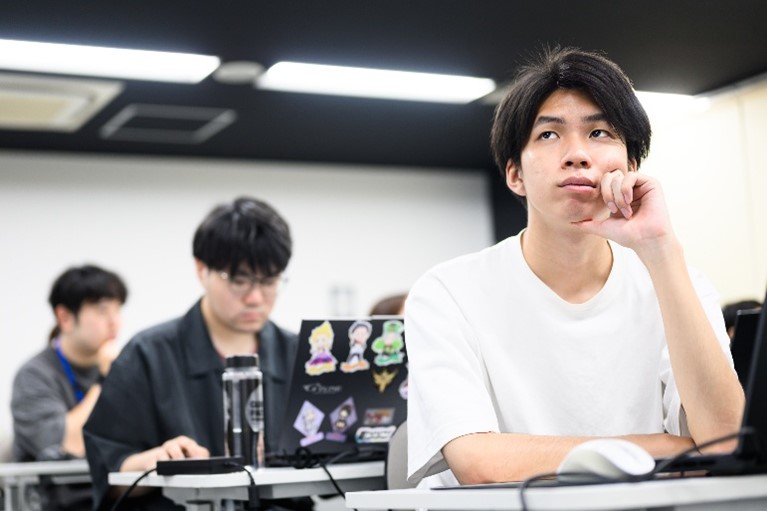 2年制ゲームプログラマー専攻1年次・高橋さん「今回の就職対策ゼミでは、面接では具体的にどんなコードが使われているかを教わっています。来週、作品審査会があり、三すくみをテーマに2Dゲームを制作しています。今日の解説を聞き、より遊びやすいようにブラッシュアップできそうです!」