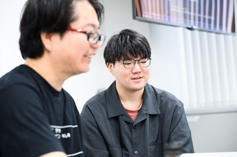 2年制ゲームプログラマー専攻1年次・北山さん「実際に採用に送られてきた応募作品を見ることができます。もっとこうした方がいいよねという点を教えていただけるので、自分の作品にも反映しやすいです!」と話します。