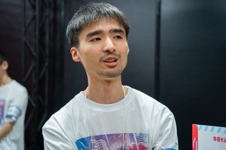 専門部 ゲームプログラマー専攻2年・新保さんは「遂にこの日を迎えました!プレイ時間は10分を想定していて、時間が長引くと、アシスト攻撃が増える『タイムアシスト機能』を追加しました!」試遊待ちが3時間になるほどの盛況ぶりで「笑顔で『楽しかった』と言ってくださるお客さまもいます。当日まで修正作業が続いていて寝不足ですが、人生で最高の日です!」と満面の笑顔を見せます。
