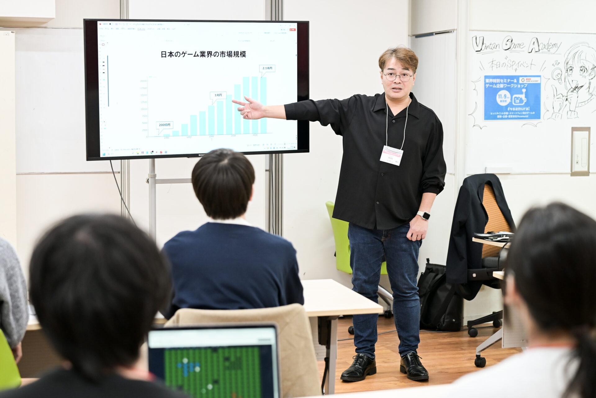 2024年時点でのゲーム業界の市場規模は2.1兆円。1970年代は200億円規模でしたが、2000年代に1兆円を突破しました。この頃はオンライン、配信、スマホゲームなどの要素が相まって、急激に勢いが増したといいます。「仕事はあるし、やりたいことに挑戦しやすい。だから、ゲーム業界はいい業界です」と話します。一方で、ユーザーの目が肥えたこと、国内外の競争が厳しいこともあり、成長はやや鈍化傾向にあることも隠さずにお話してくれました。