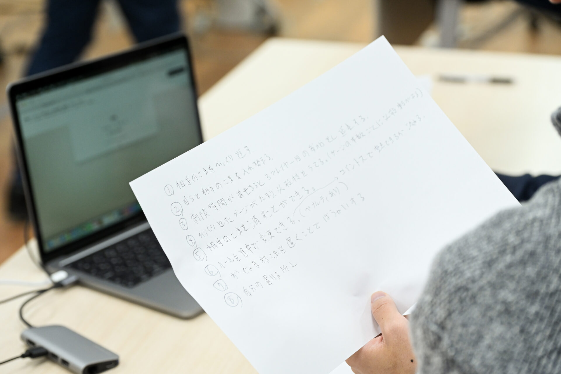 今回は設計に生成AIを使用。プロンプトを入力するために、選んだアイデアを改めて言語化します。プロンプトの入力は中村さんや、当校の学生スタッフもサポート。参加者、中村さん、学生はゲームや自分の趣味などについて話をしつつ、和気あいあいとした雰囲気の中で作業を進めていました。